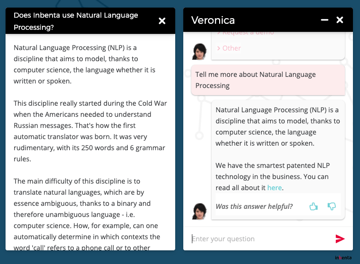 Lorsque vous développez votre chatbot avec Inbenta, vous avez également la possibilité d’utiliser une bulle latérale où vous pouvez approfondir le contenu, ce qui représente un autre excellent moyen de fragmenter l’information.